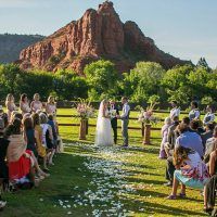 Memorial Day in Sedona is always packed with weddings being held in virtually every wedding venue in town. This 2016 wedding at Rancho Los Lagos was so fun. First, we were so happy that one of our favorite Sedona wedding planners, Laura Marolakos of Heart of Sedona Weddings, was at the helm of this event. As always, every detail was perfectly planned and executed. Sedona Bride Photographers did the photography. Classic Party Rentals did a great job with the rentals. Show Stoppers provided the florals and lighting. Laura spread the rose petals just at the last minute before the ceremony so the wind would not blow them away. The ceremony arrangements were gorgeous with huge peonies, erimirus, roses and orchids. Dozens upon dozens of these pretty, square floral details were used randomly all along the family style dining tables. Show Stoppers provided our popular string light kiosks and colorful uplighting on the huge … [Read more...]
